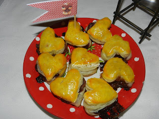 Estende-se a massa folhada, cortam-se com os moldes que quiserem (estes foram coração) e preencham com uma noz pequenina de Nutella.